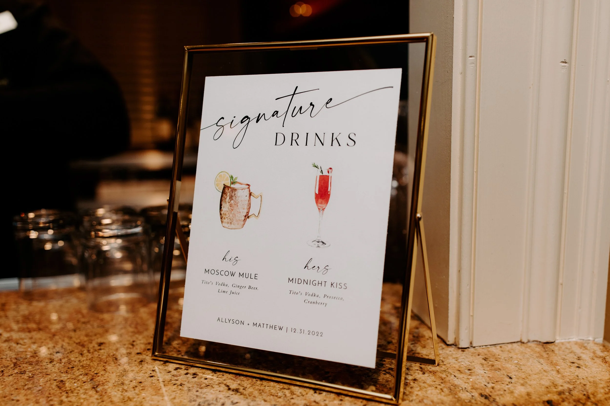 One of my favorite little details of their wedding day was that they had a signature drink sign from Etsy that matched their New Years wedding theme with a “Midnight Kiss”. Sometimes it’s nice to have a nod to your theme like this. I thought the sign itself was really cute!