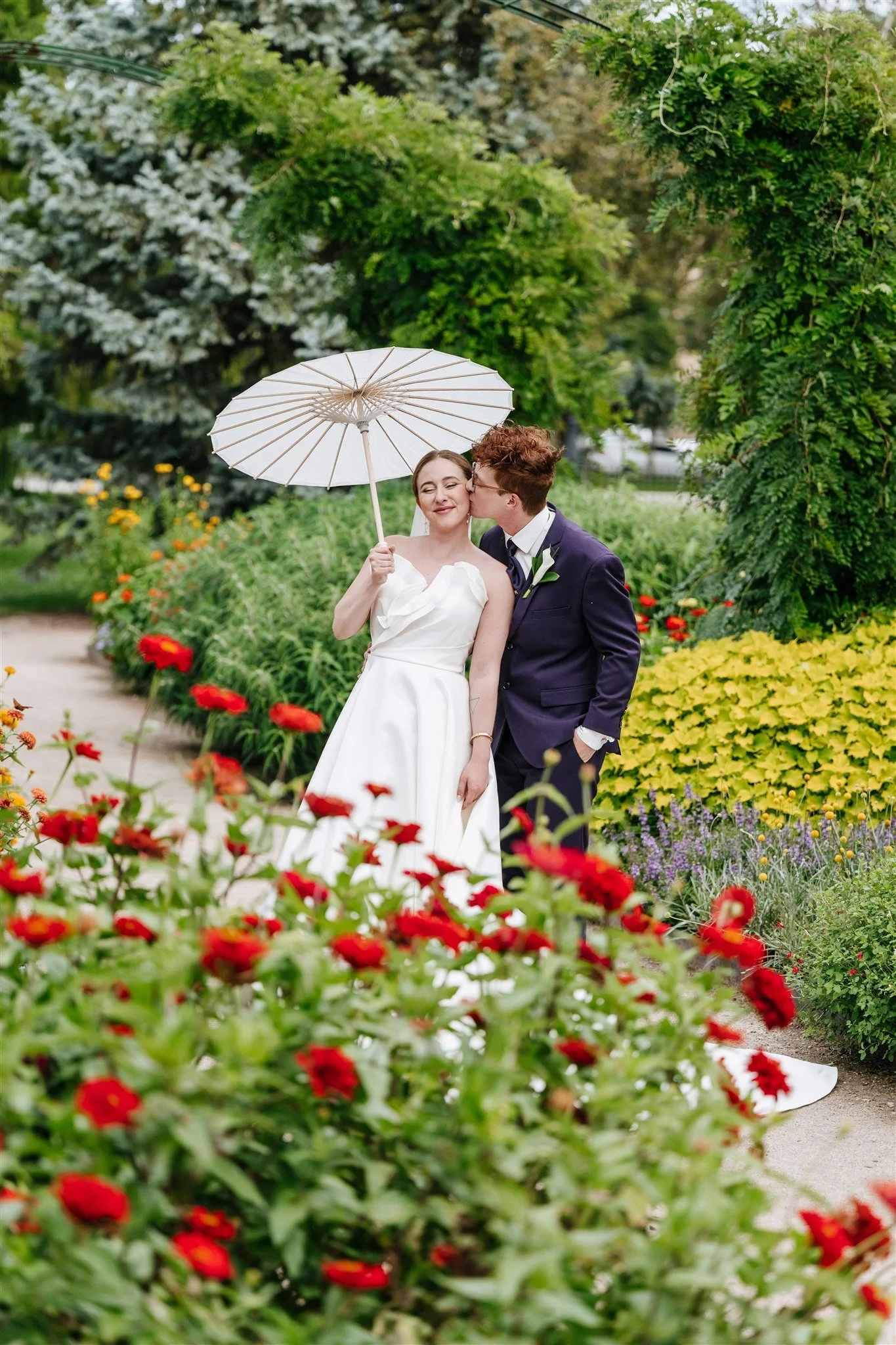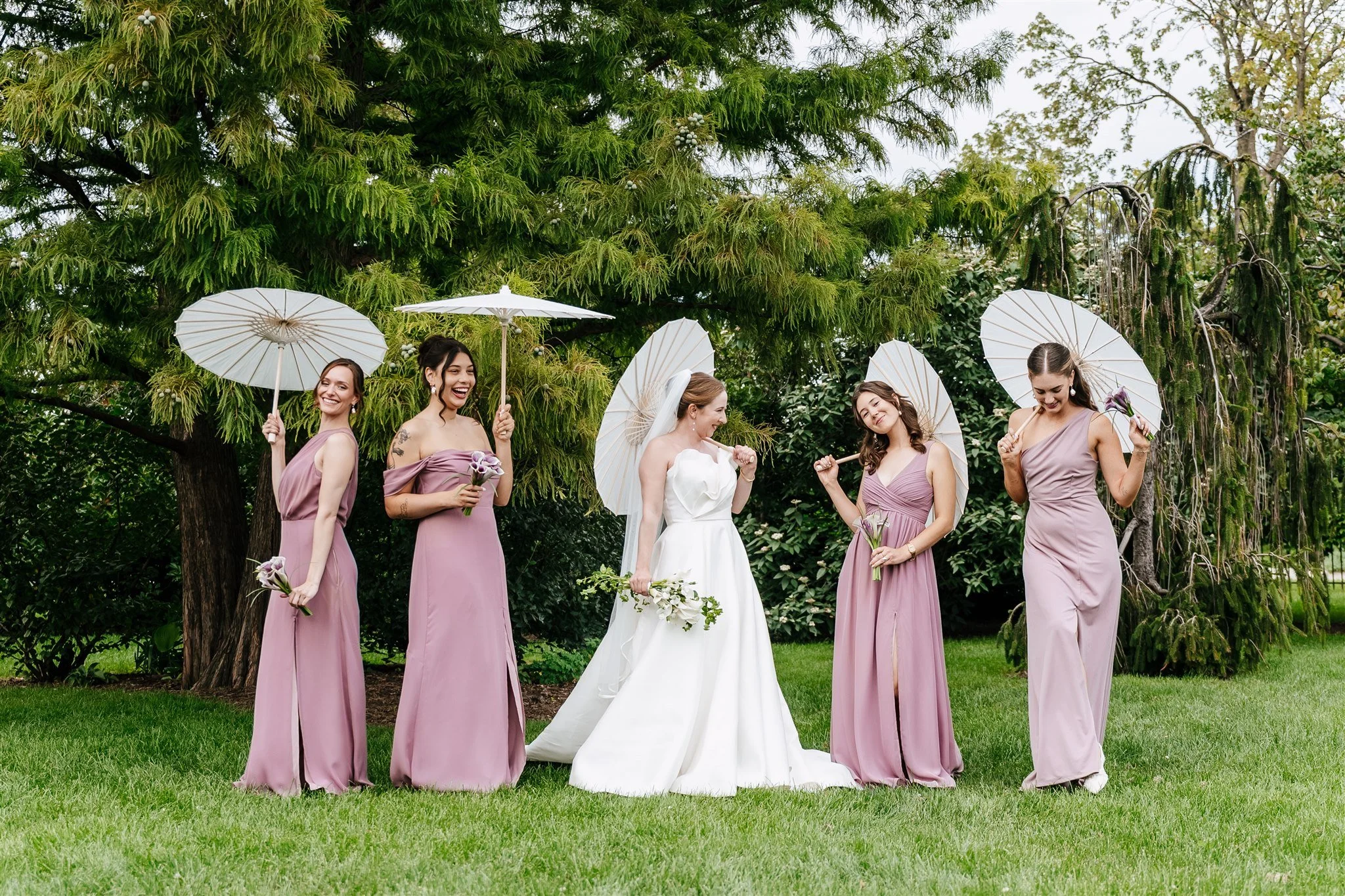 We were on the way to the venue when we heard from Sarah’s side that something went wrong with her bouquet. We were able to take over and fix it by using the inspiration photo, going to a few stores, buying multiple alternatives at Trader Joe’s, and letting them know how to make it better before we met up with them at the venue. Claire, one of our lead coordinators, worked some true magic so that they could use the actual bouquet for their photos while at the conservatory for photos! They even whipped out parasols for the photos and they were SO cute!! We loved too that Callen got to represent the main color for their wedding and they had their wedding party in lighter colors to really bring attention to the couple.