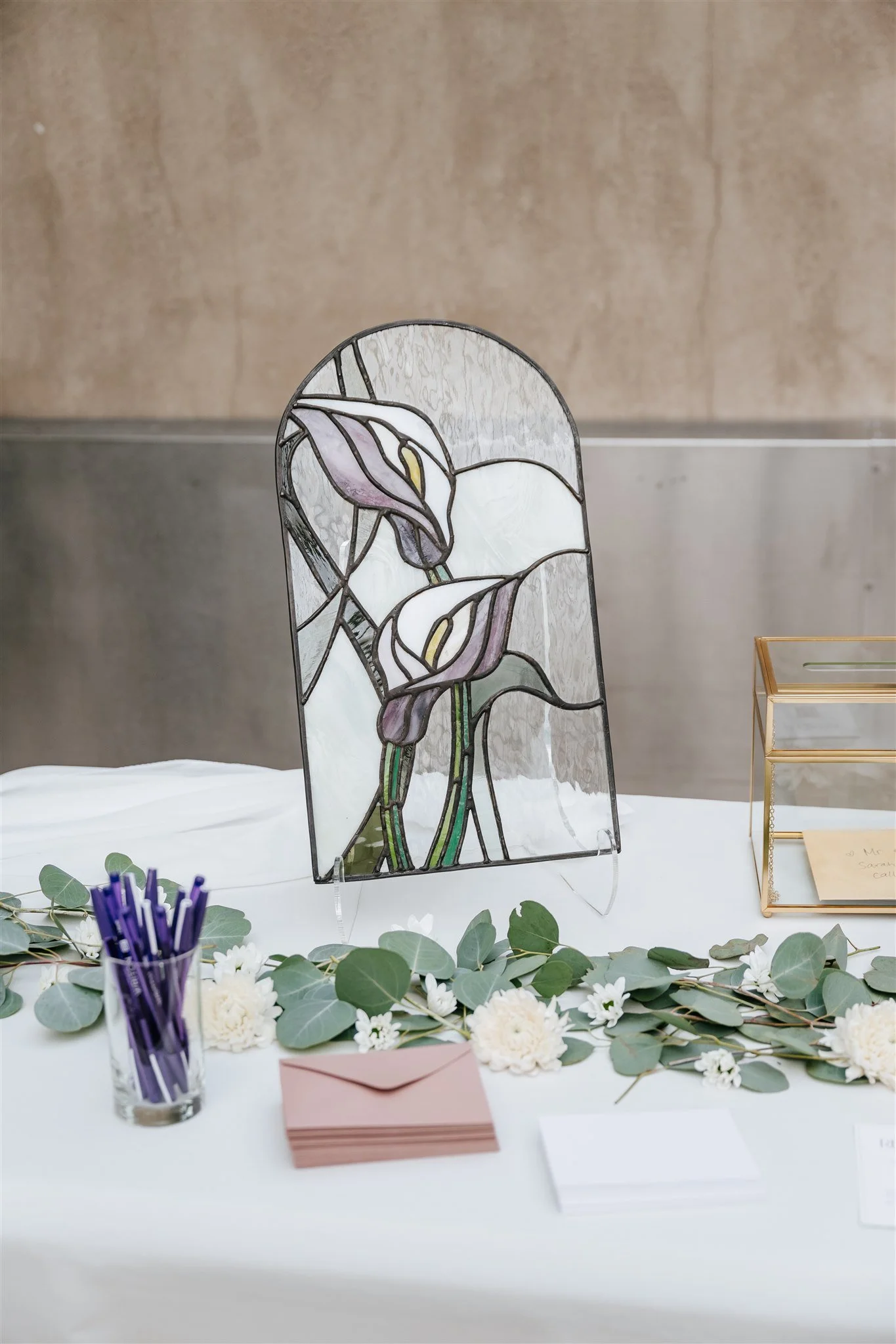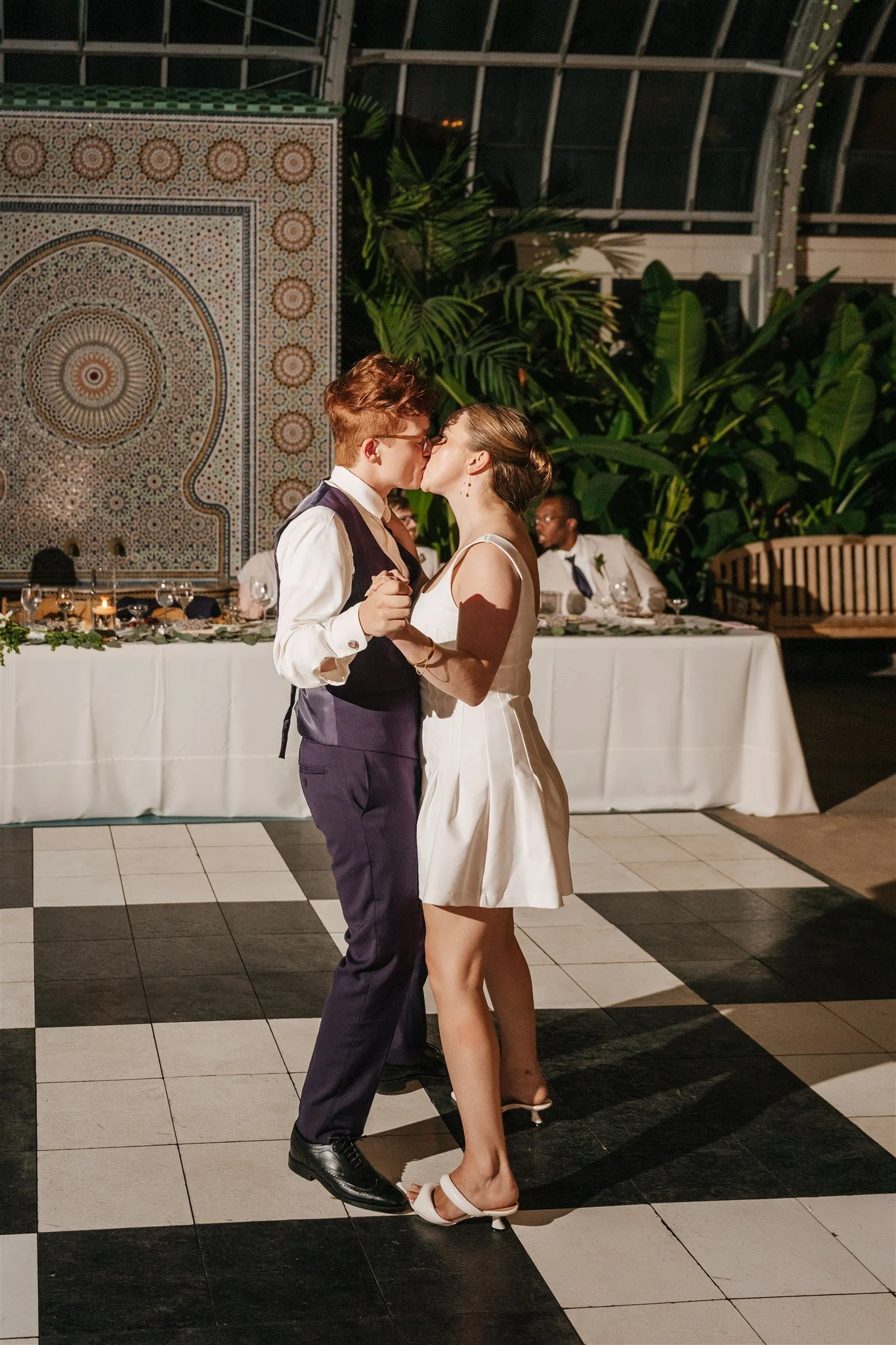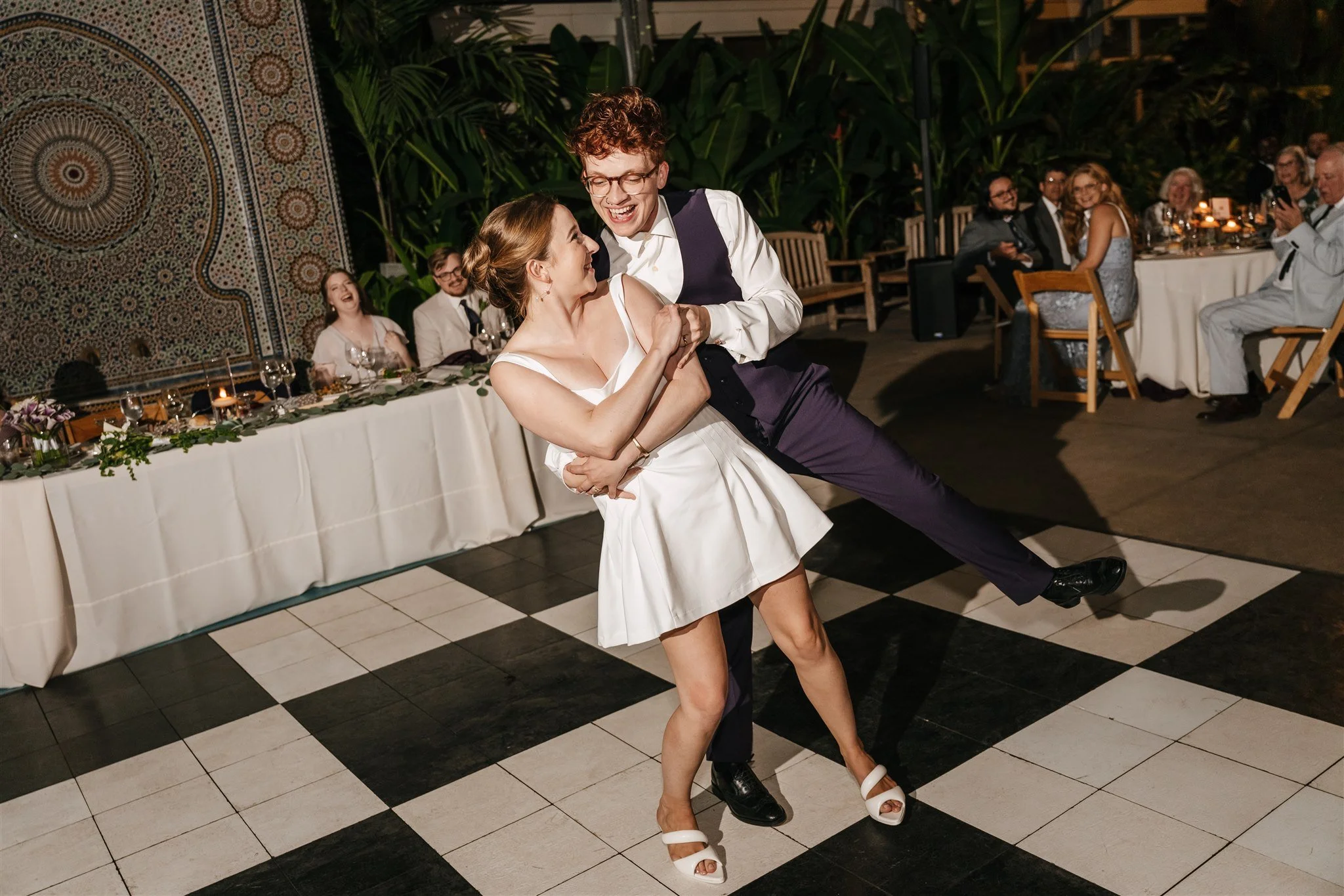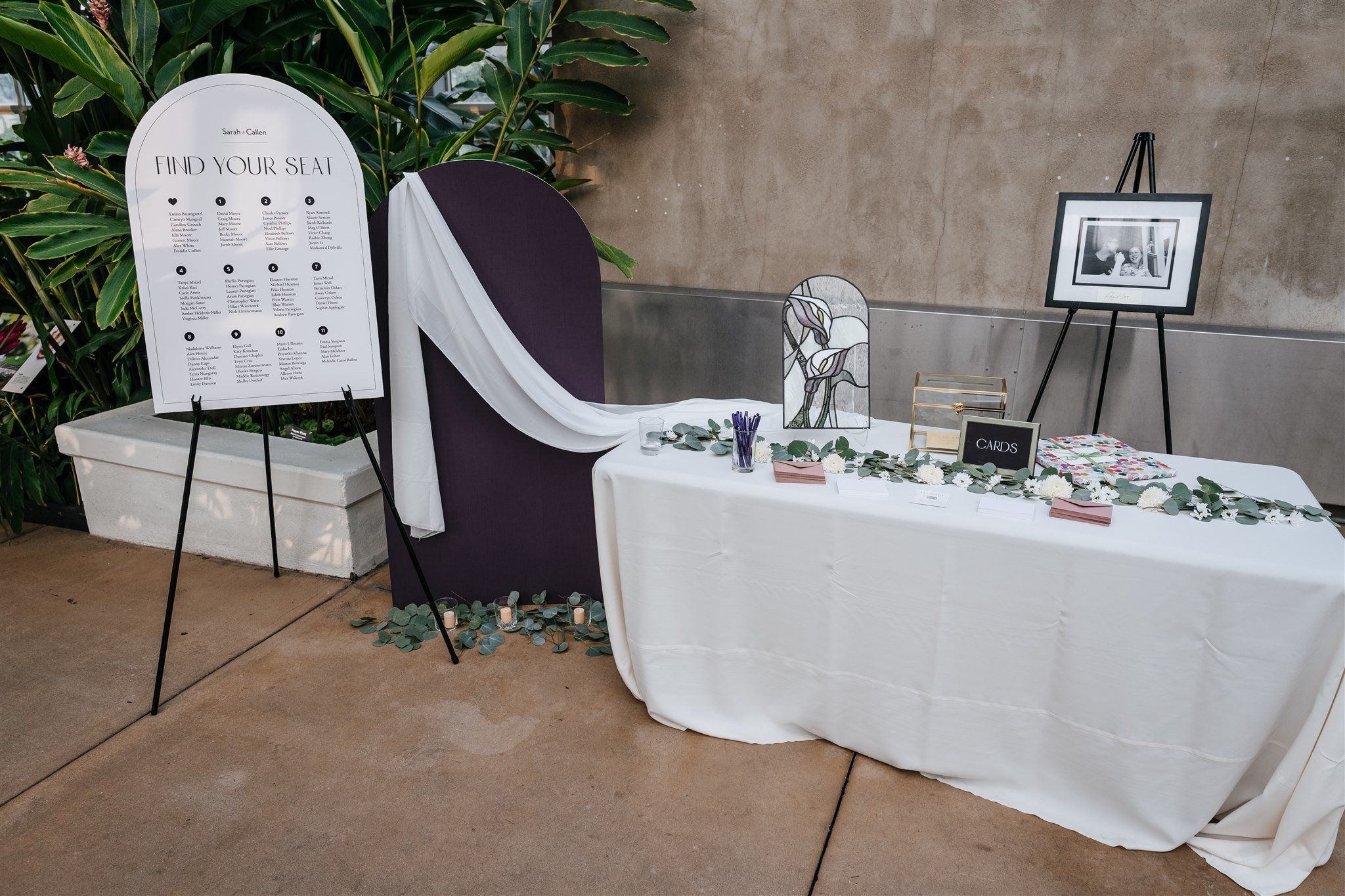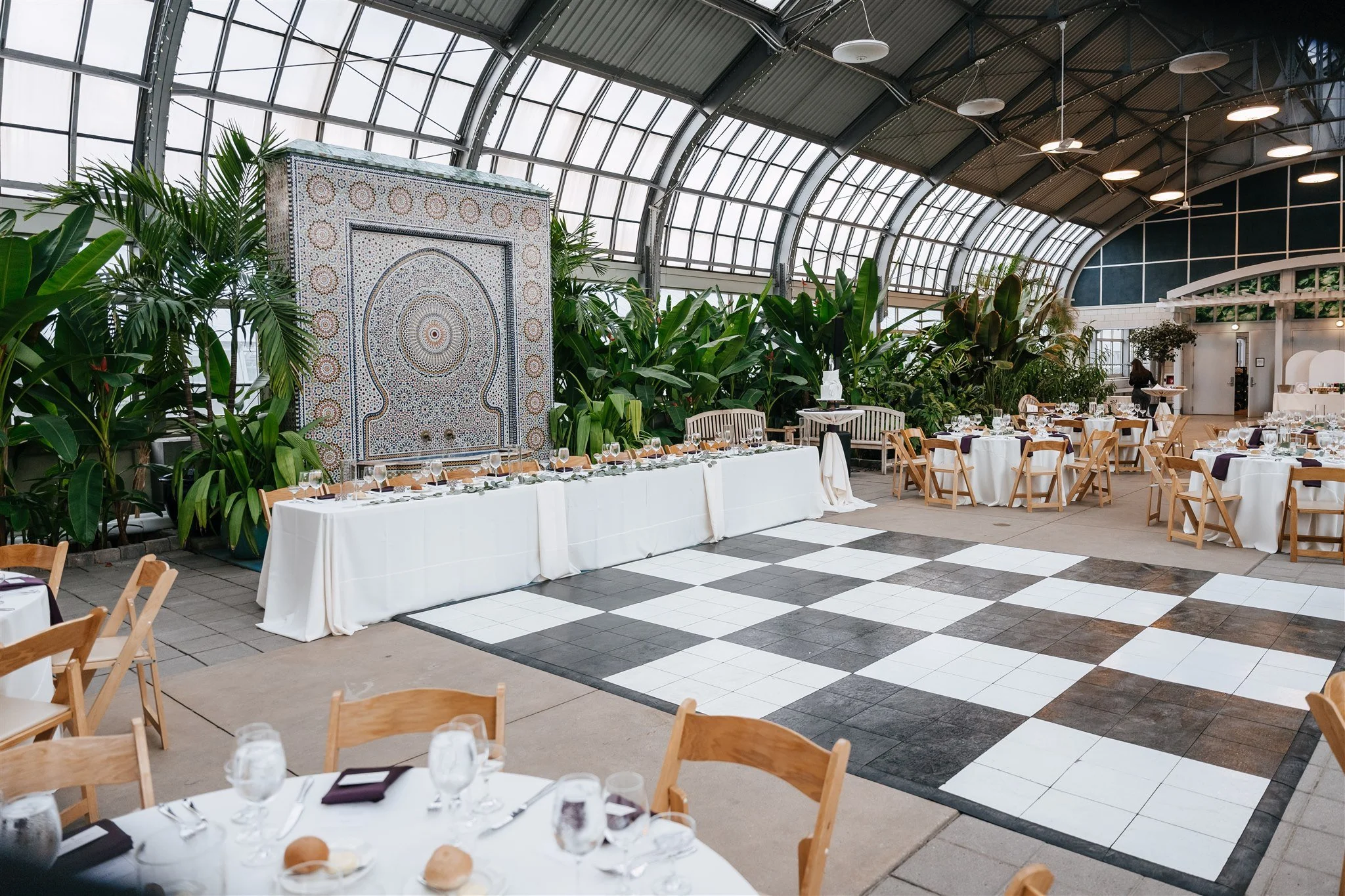 We were setting up their DIY personal decor for the entire cocktail hour while Sarah and Callen spent cocktail hour to themselves in the suite. We had really loved their vision, their direction, the photo of when they first were together, the custom stained glass they had made of their wedding flowers and the piece for their cake topper… EVERYTHING was so intentional and beautiful! And you truly can’t beat the beauty of the Horticulture Hall for your wedding reception. All of the plants make it so easy, and we loved the black and white checkered dance floor to really make it feel ready to party and dance!