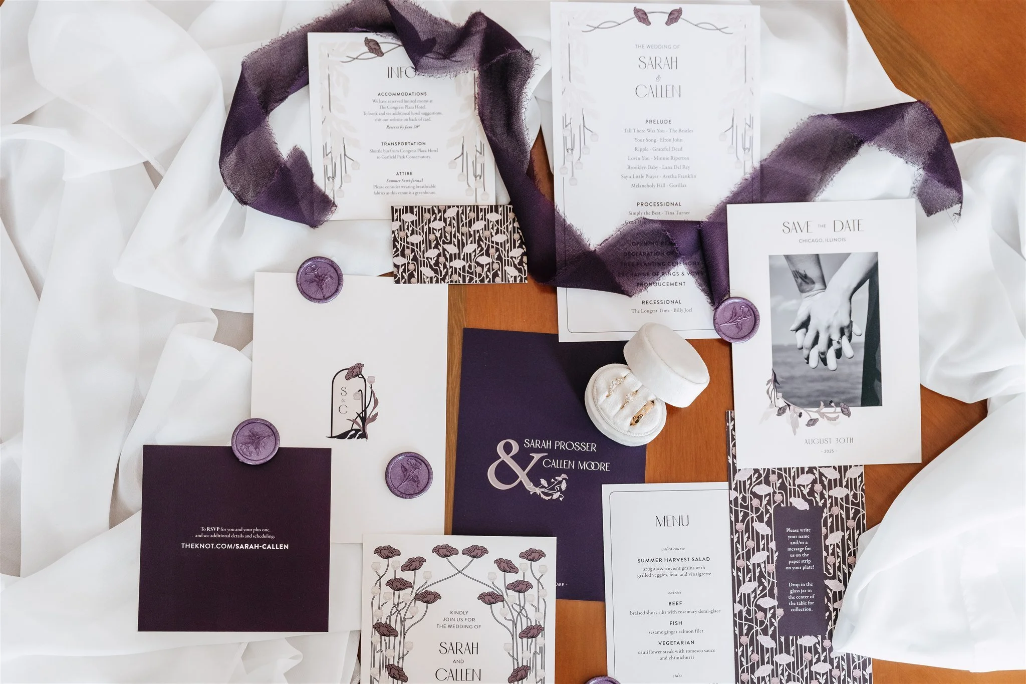 Sarah and Callen both got ready in the same space at Congress Plaza Hotel. They got dressed separately so that they could still do the first look, but all of the prep generally happened in the same space. It makes it nice and easy for your media team to be able to go from one person to the other that way! We also loved the purple that you’ll see throughout their wedding day in their details - it really was one of the most intentional weddings we have worked in making sure everything was cohesive!