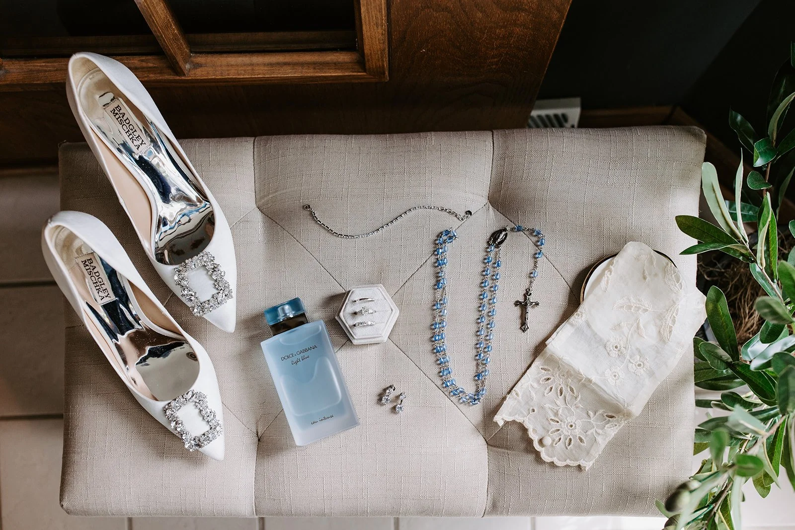 The day started off at Danielle’s parent’s house for the girls to get ready at. Their details shots are so precious - the blues throughout the wedding day were so elegant and sleek from the jewelry, invitations, and even the perfume!