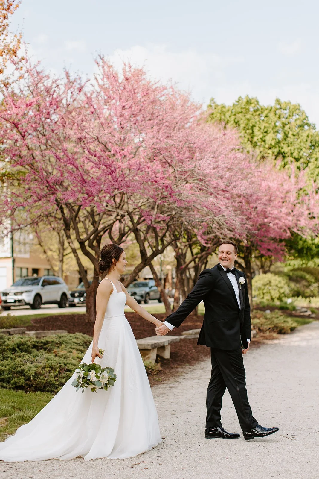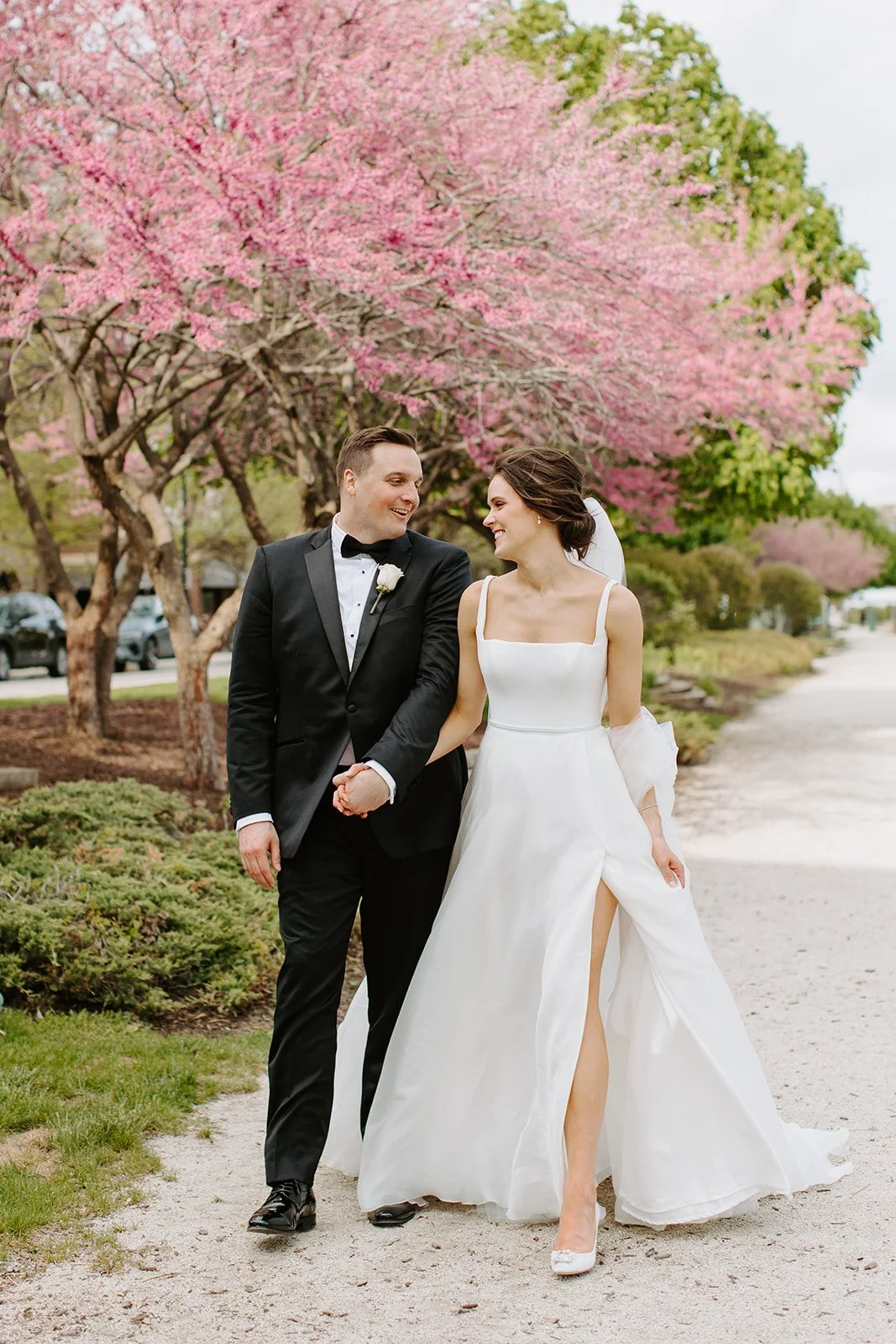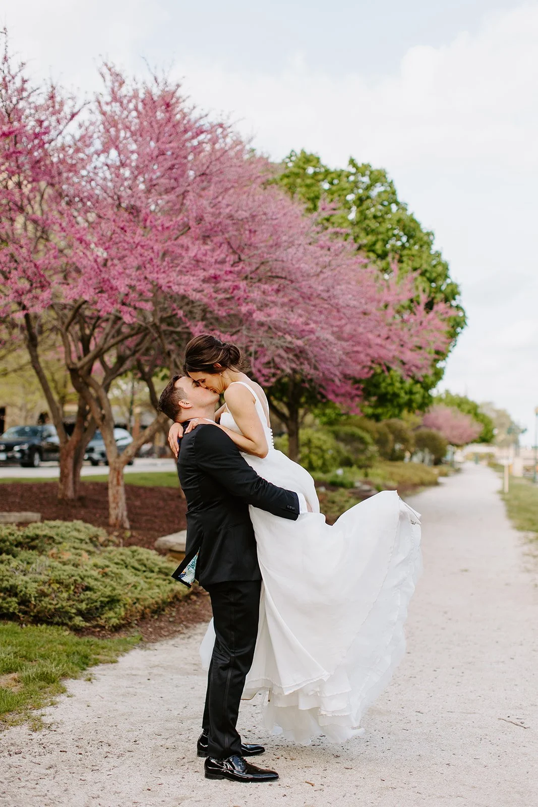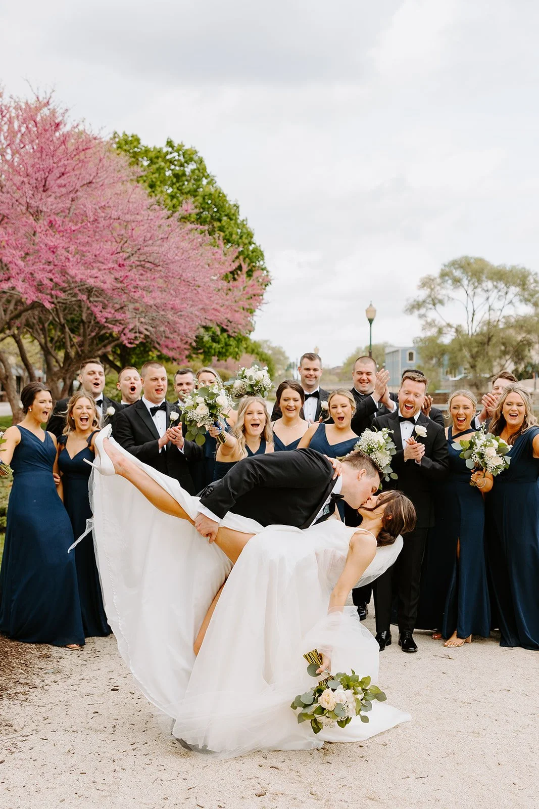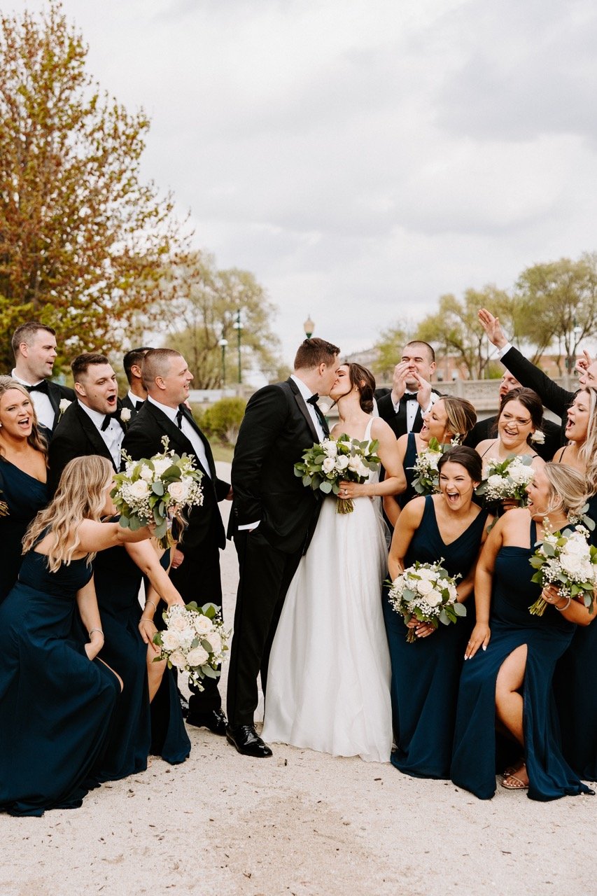 Our favorite part of their gallery are the photos in the Lemont area at Waterfall Glen. Because it was a beautiful spring day, the trees were full of lively flowers that really were so beautiful. The wedding party in the black tuxes and the dark blue dresses were also carrying over the overarching classic, modern, and elegant feeling for the day! The girls kept the same color palette, but they had different necklines which is always nice to keep them the most comfortable.