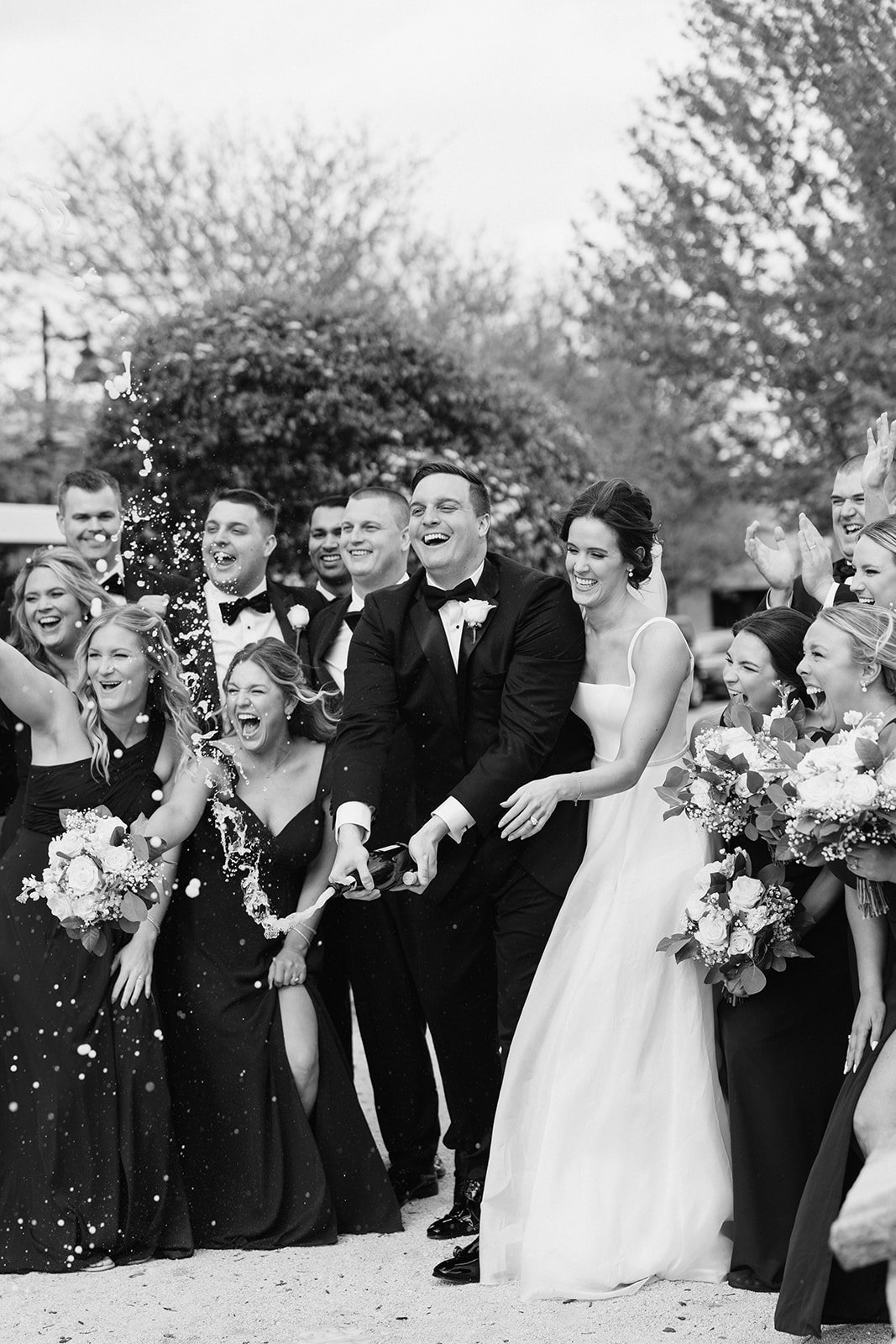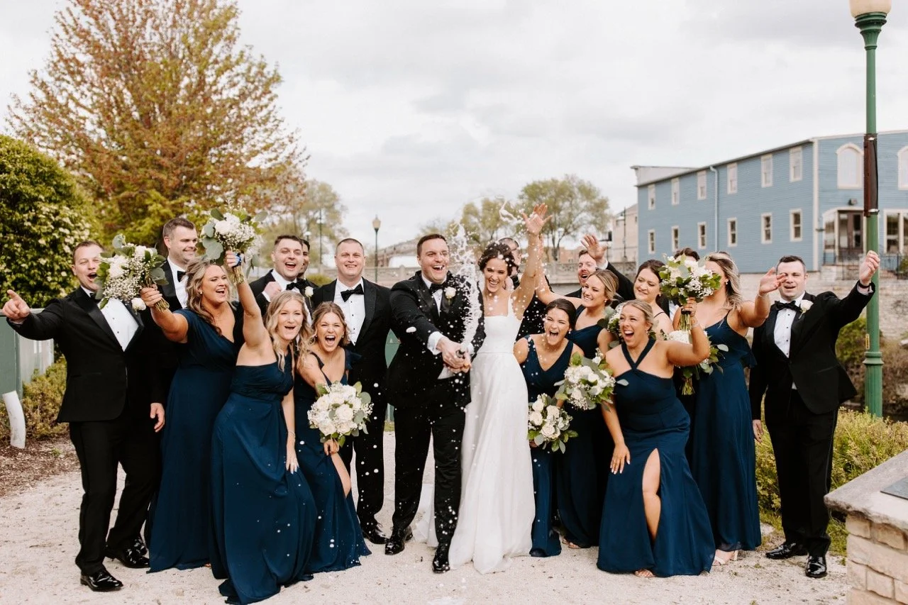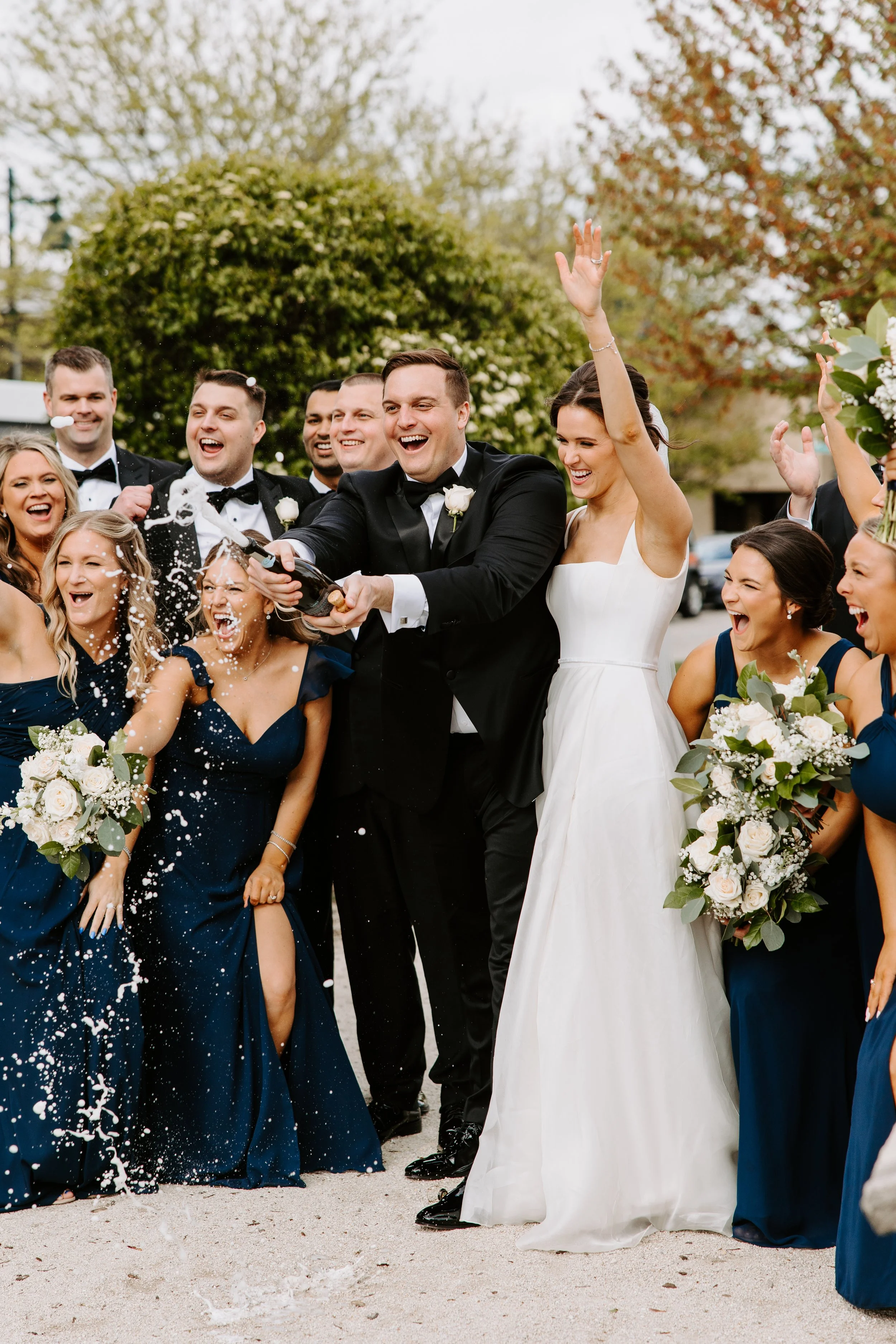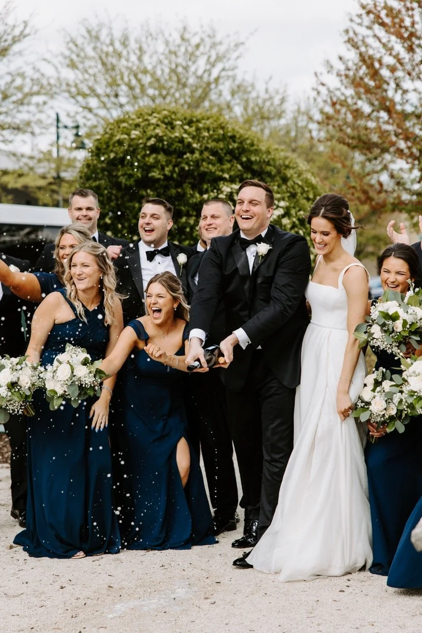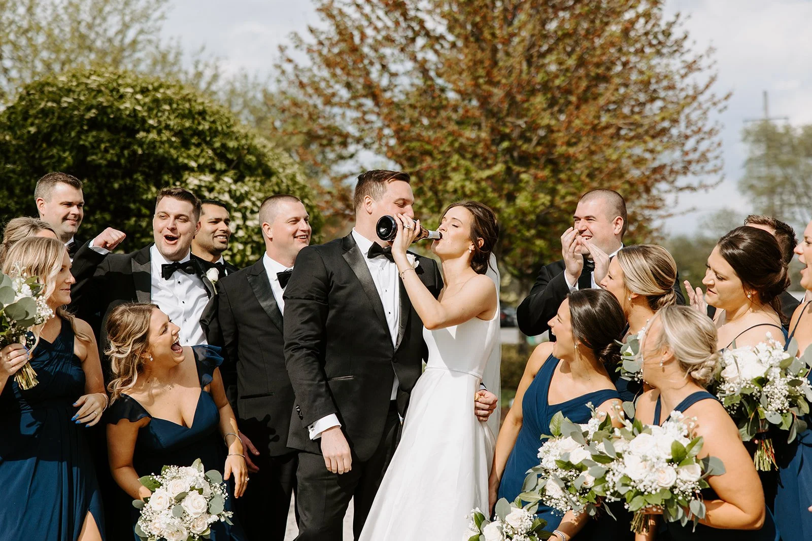 Our favorite part of their gallery are the photos in the Lemont area at Waterfall Glen. Because it was a beautiful spring day, the trees were full of lively flowers that really were so beautiful. The wedding party in the black tuxes and the dark blue dresses were also carrying over the overarching classic, modern, and elegant feeling for the day! The girls kept the same color palette, but they had different necklines which is always nice to keep them the most comfortable.