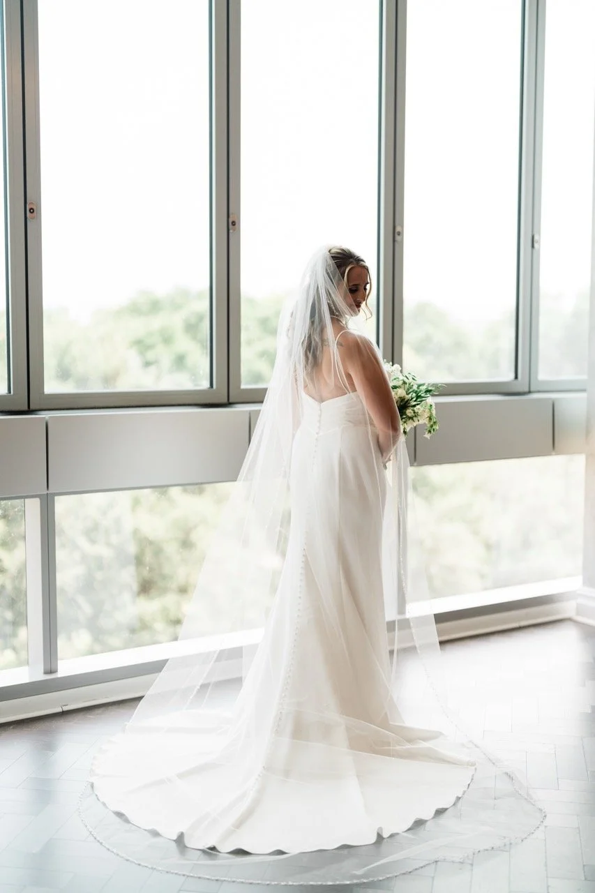 If you have the opportunity to utilize a wedding suite so lovely and large, it’s definitely more convenient for you to have everything in one place like the ladies had it with Michelle! They really could take their time and relax knowing that they really didn’t have far to go and weren’t going to leave anything behind at the hotel once they set up in the morning. Once hair and makeup was finished, the girls all got dressed and ready for the first looks and photos. Michelle’s sleek dress and long, simple veil really helped tie in the modern, timeless look too.
