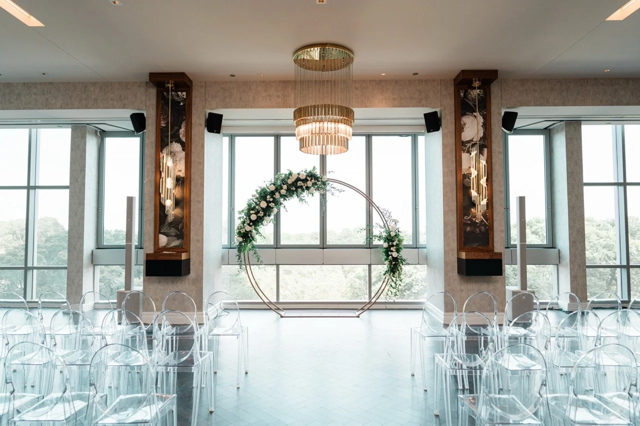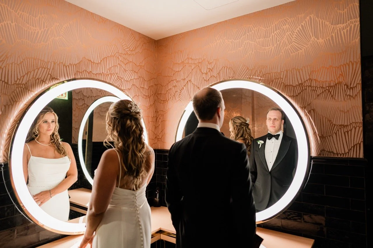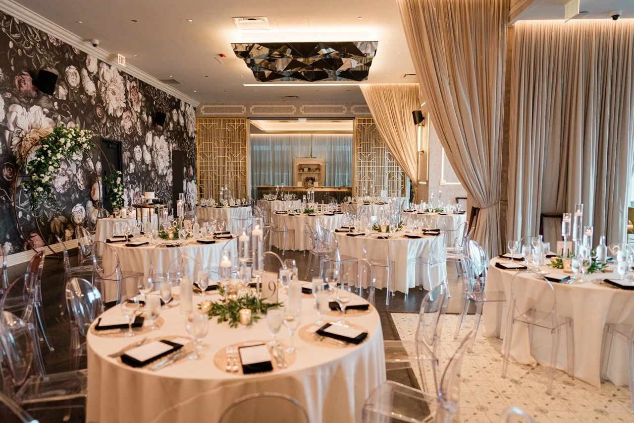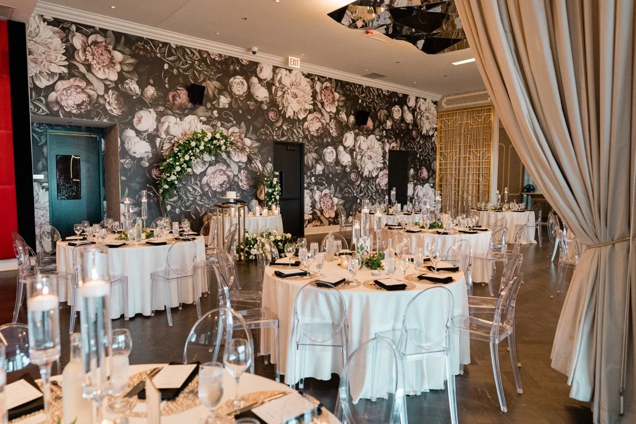 LM Studio is an absolute modern dream wedding venue - they have so many cool features to the space that really make it stand out and we adore. The gold detailing throughout the space makes it really easy to have an accent color, the floral print wall makes it so you really don’t have to dress up the space, the clear chairs are a nice modern twist as opposed to classic chiavari chairs most wedding venues have, and the smaller red, velvety wall makes for an extra spice we love too. LM Studio is absolutely stunning from top to bottom and we loved seeing the space get transformed for the reception!
