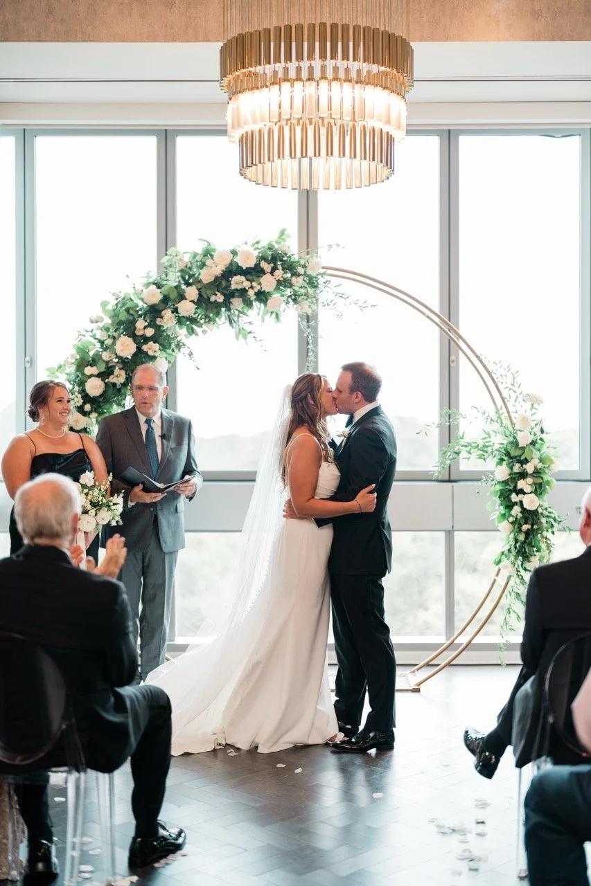 The ceremony was set in the normal location in the venue right along the floor-to-ceiling windows overlooking the city. They had such a sweet, quick ceremony and then were right off to that time together in the wedding suite while the guests were ushered downstairs during the room flip.