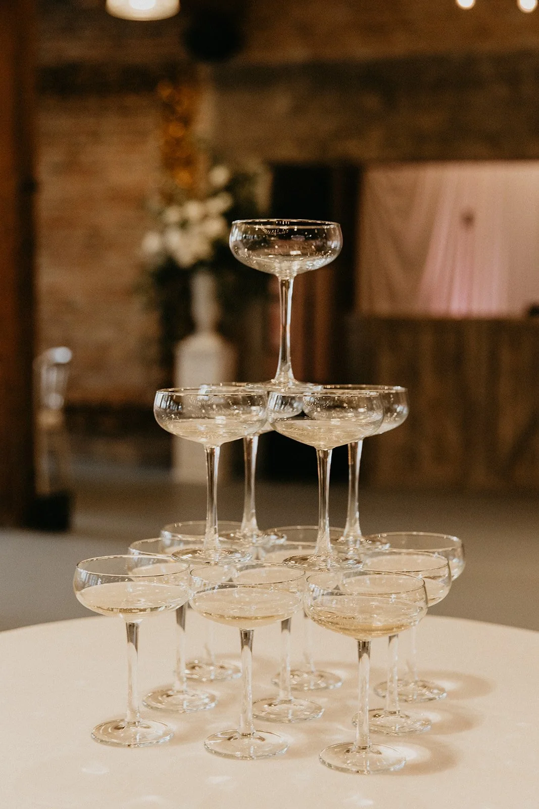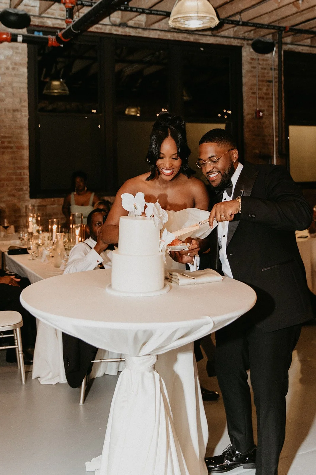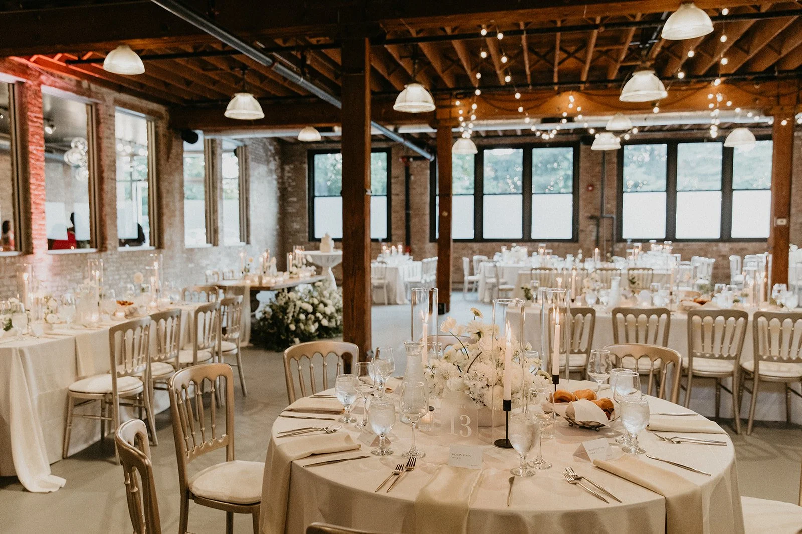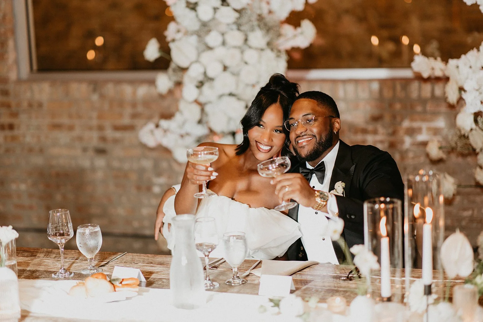 As the cocktail hour was happening after their beautiful ceremony in the courtyard at Artifact Events, the guests were directed inside for cocktail hour and the reception space was nearly ready. We absolutely loved the all-white decor and the warmth of the space - it was truly so beautiful and modern! The sweetheart table also was incredible - the flowers were amazing and the venue’s wooden table really brought everything together in our opinion. We have been leaning more towards sweetheart tables because your wedding party can sit with all of the guests they know while you and your love have an intimate dinner together. It’s also an easier way to make a statement because you have to decorate less but it can really be a beautiful focal point.
