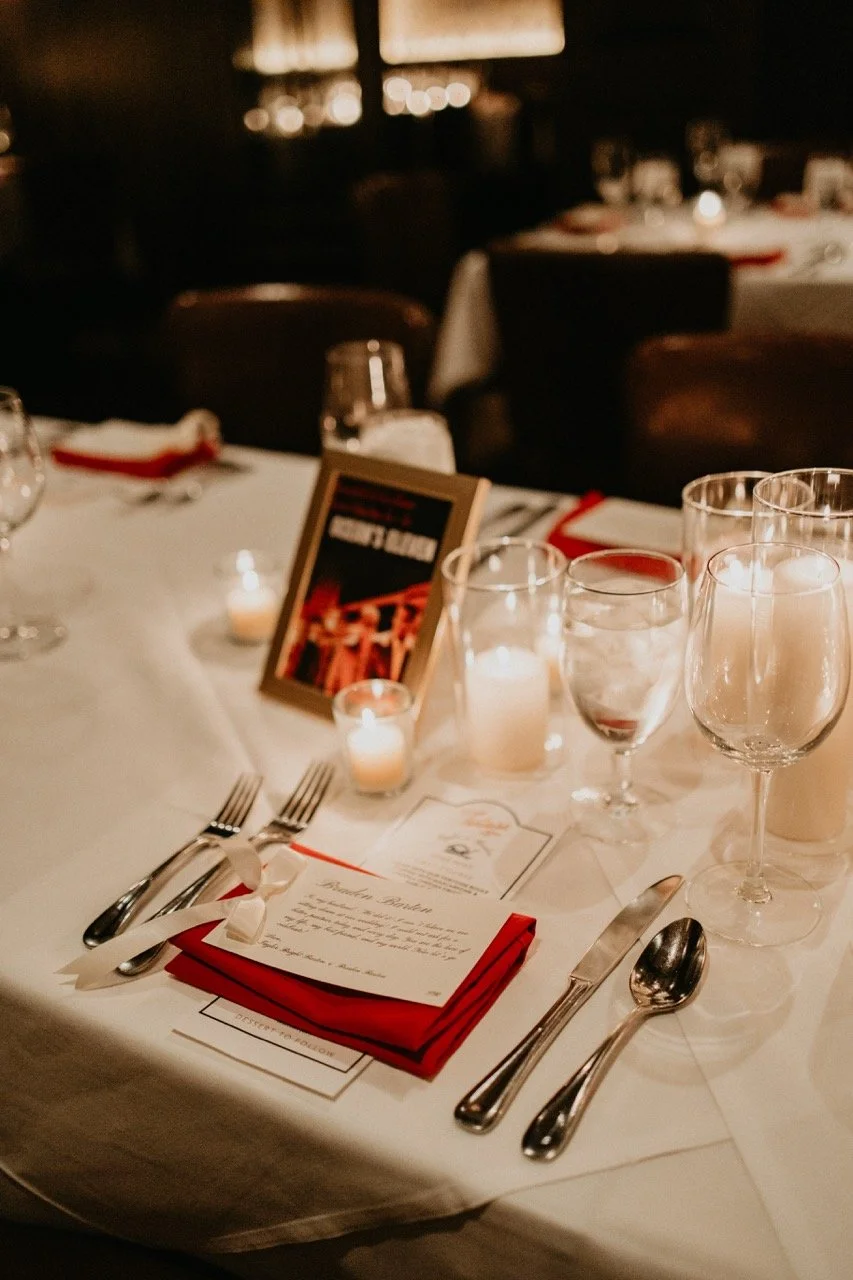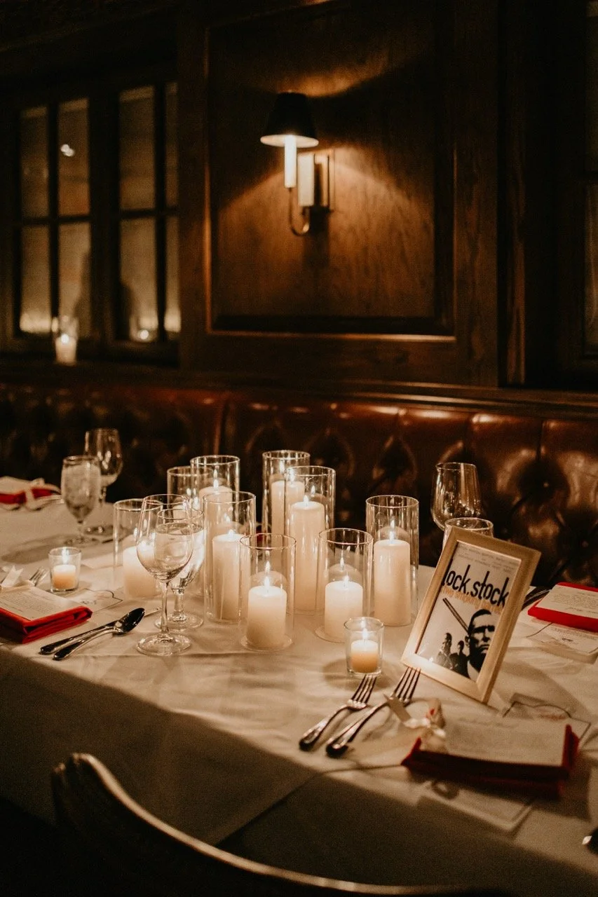We got to work after the ceremony with the room flip with moving all of their candles, setting the movie poster table numbers, and placing thank-yous at each person’s seat, which was such a sweet touch! Everything was so moody and romantic for the dinner and it was great helping Taylor and Braden’s vision come to life. For cocktail hour, the jazz band got started and the espresso martinis were flowing!